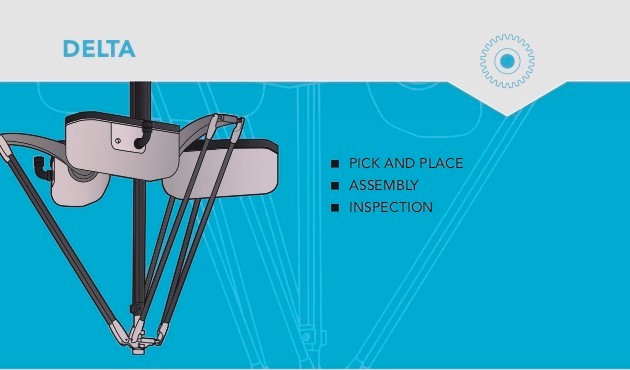 Delta robots, also referred to as “spider robots,” use three base-mounted motors to actuate control arms that position the wrist. Basic delta robots are 3-axis units but 4- and 6-axis models are also available.