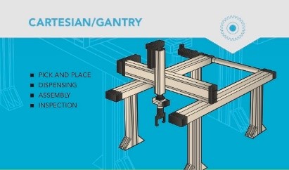 Cartesian robots typically consist of three or more linear actuators assembled to fit a particular application. Positioned above a workspace, cartesian robots can be elevated to maximize floor space and accommodate a wide range of workpiece sizes. (When placed on an elevated structure suspended over two parallel rails, cartesian robots are referred to as “gantry robots.”)